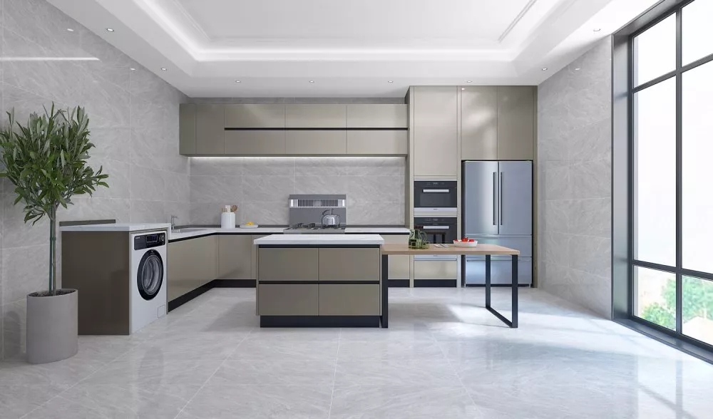 通體中板400×800mm是符合瓷磚鋪貼視覺感的黃金分割規格,能很好地延伸了廚房的視覺空間,營造出一種明亮干凈、柔軟輕松的氛圍,置身其中,手上準備著一家人的三餐,眼中眺望窗外的風景,幸福的味道伴隨著煙火氣在空氣中流淌。